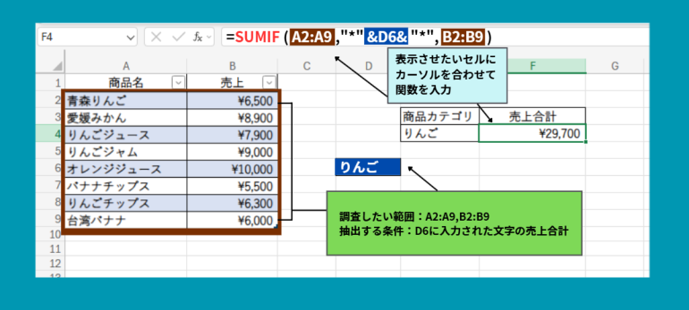 例えば、D6セルに『りんご』と入力し、その文字を含む売上を合計したい場合です。