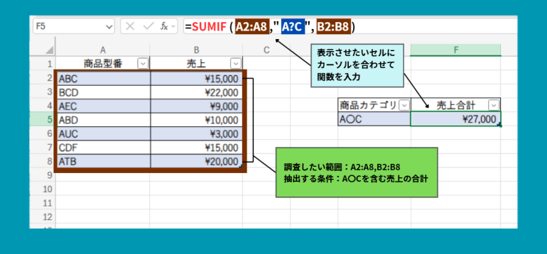任意の1文字を含むデータを合計する場合は、ワイルドカードの『?』を使用します。