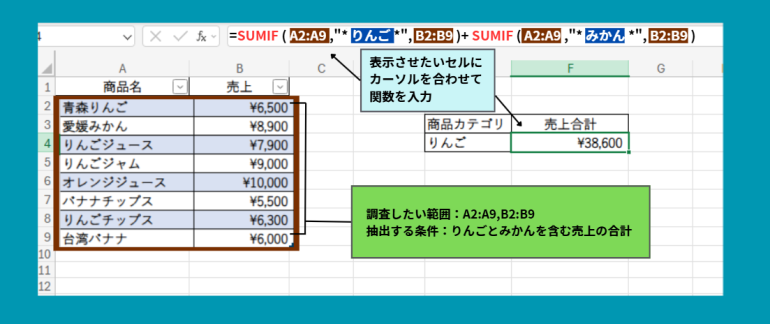 =SUMIF(A2:A9,”*りんご*”,B2:B9)+SUMIF(A2:A9,”*みかん*”,B2:B9)