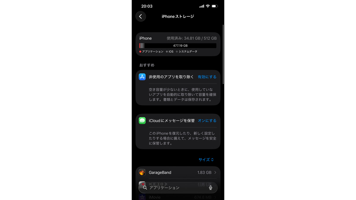 もう1つ大きな要素として挙げられるのが、ストレージの容量だ。iPhone 17eでは最低容量が256GBになっており、選択肢は256GBと512GBの2つになった。試用した実機は512GB版だったが、セットアップした段階でOSやApple IntelligenceのAIモデル、プリインストールアプリなどが30GBほど使っている。iPhone 16eの128GBだと、あまり写真や動画を残しておくことができない。