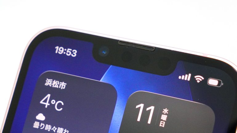 まずはデザインから。2世代目となるiPhone 17eだが、一見した印象は先代のiPhone 16eから変わっていない。iPhone 14に近い筐体を採用しており、Face IDやセルフィーに使う内側カメラも、iPhone 17シリーズのダイナミックアイランドではなく、ディスプレイが凹んだ形のノッチとなる。アルミニウムのフレームも、iPhone 16eとの共通項だ。