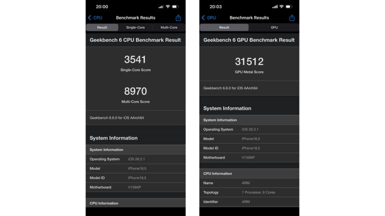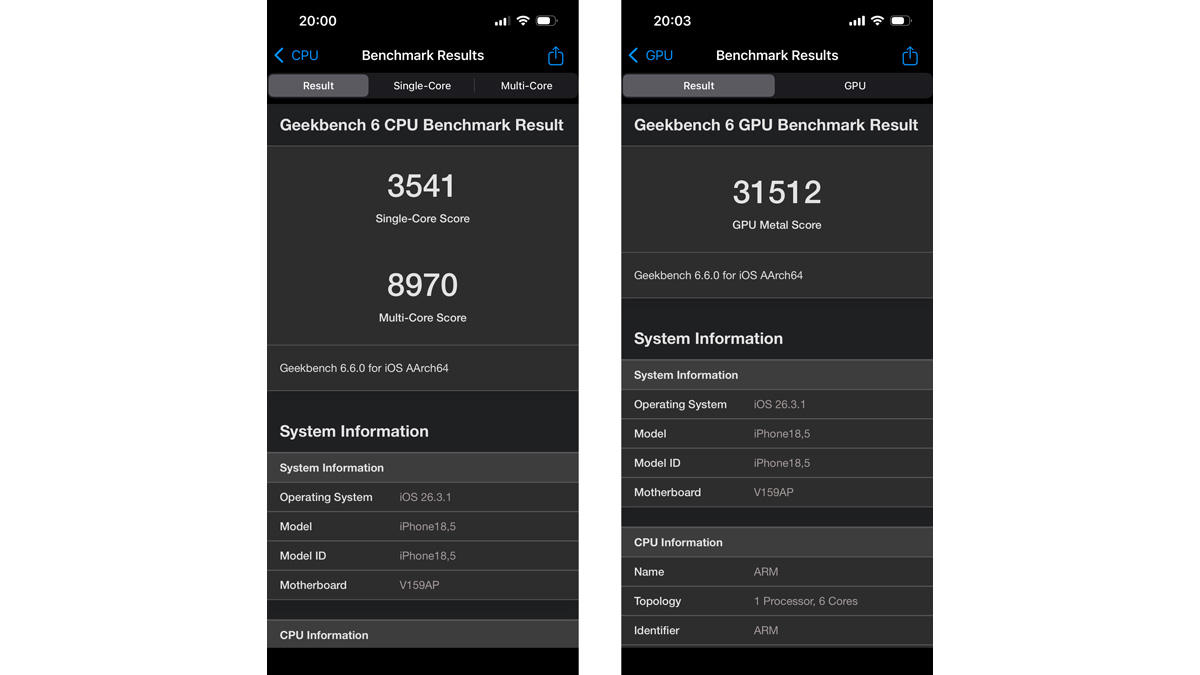 処理能力は高く、アプリの起動やレスポンスは抜群に高い。A19は、ハイエンドモデルであるiPhone 17に搭載されているチップセットのため、当然と言えば当然だが、10万円を下回る端末としてはかなり優秀だ。実際、ベンチマークアプリで計測したスコアも、上位モデルとそん色ない数値が出ている。