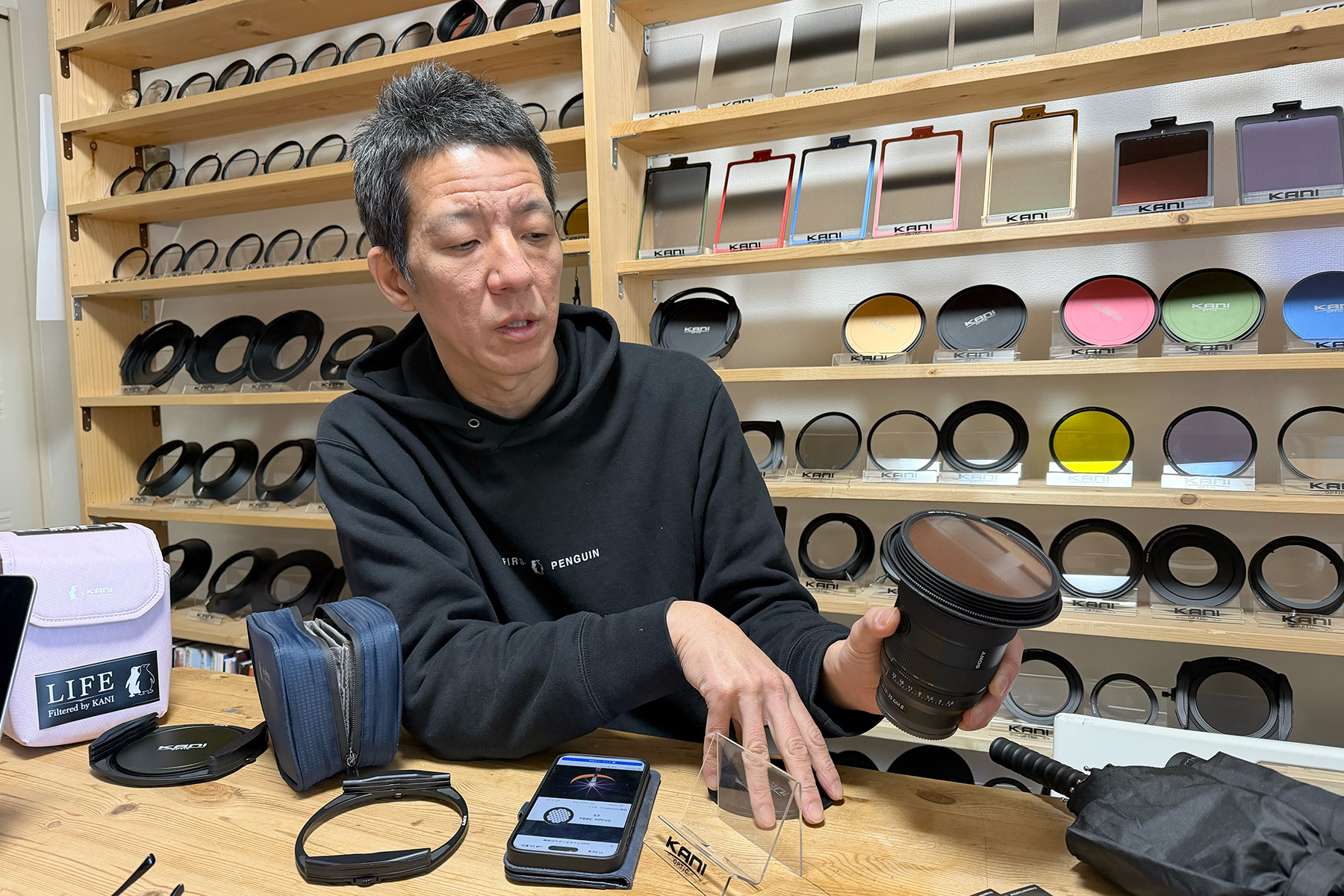 撮影の合間に、KANIフィルターの輸入代理店であるロカユニバーサルデザインを訪ねた。代表の伊藤公彦氏に、風景撮影におけるフィルターの重要性について話を伺った。高品質でタフな光学ガラスを使用したKANIフィルターは、解像度を損なうことなく、白トビを抑えたりシャッタースピードを自在にコントロールしたりできるプロ御用達のアイテム。小平尚典さんも愛用している。