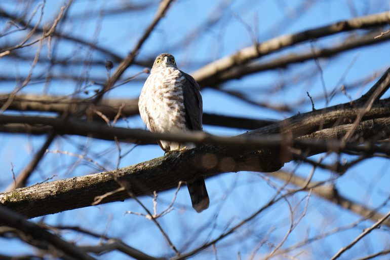 井の頭公園では、春の訪れを感じさせる多くの野鳥に出会うことができた。特に大量のメジロが飛来しており、その俊敏な動きを30コマ連写が捉える。また、上空には猛禽類のハイタカも姿を見せたが、進化したAFがその瞳をしっかりと認識し続けた。