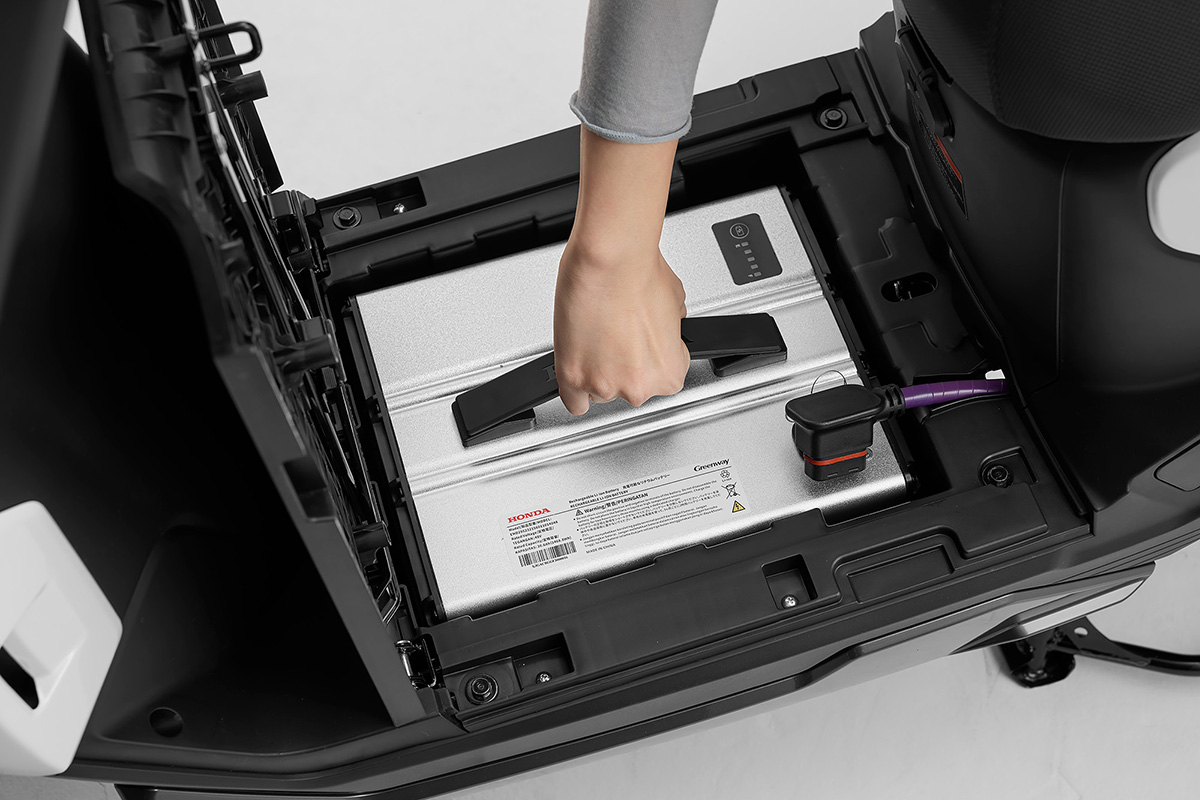 ・動力用電源となる着脱式バッテリーをフロアステップ下に配置。満充電状態のバッテリーを使用した際の一充電あたりの走行距離は、81km(30km/h定地走行テスト値)を実現。
