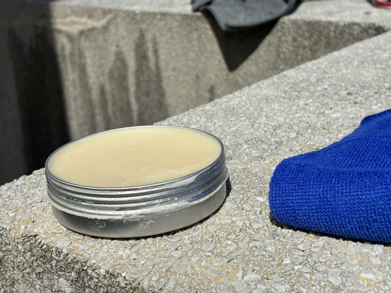 平べったい円形の缶を開けると、そこにあるのは固形ワックスと専用スポンジ。これで自分の手を使ってワックスを塗っていけ、ということだ。個人でやるには一番手のかかる形状のワックスである。