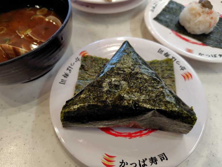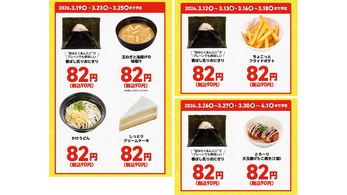 まずは、節約の味方、かっぱ寿司から。かっぱ寿司では、現在、平日・店内飲食限定で「かっぱの挑戦 平日得メニュー」として、税込90円で「香ばし炙りおにぎり」や「かけうどん」、「ちょこっとフライドポテト」などを提供。日によってお得なメニューが違うため、チェックして挑みたい。