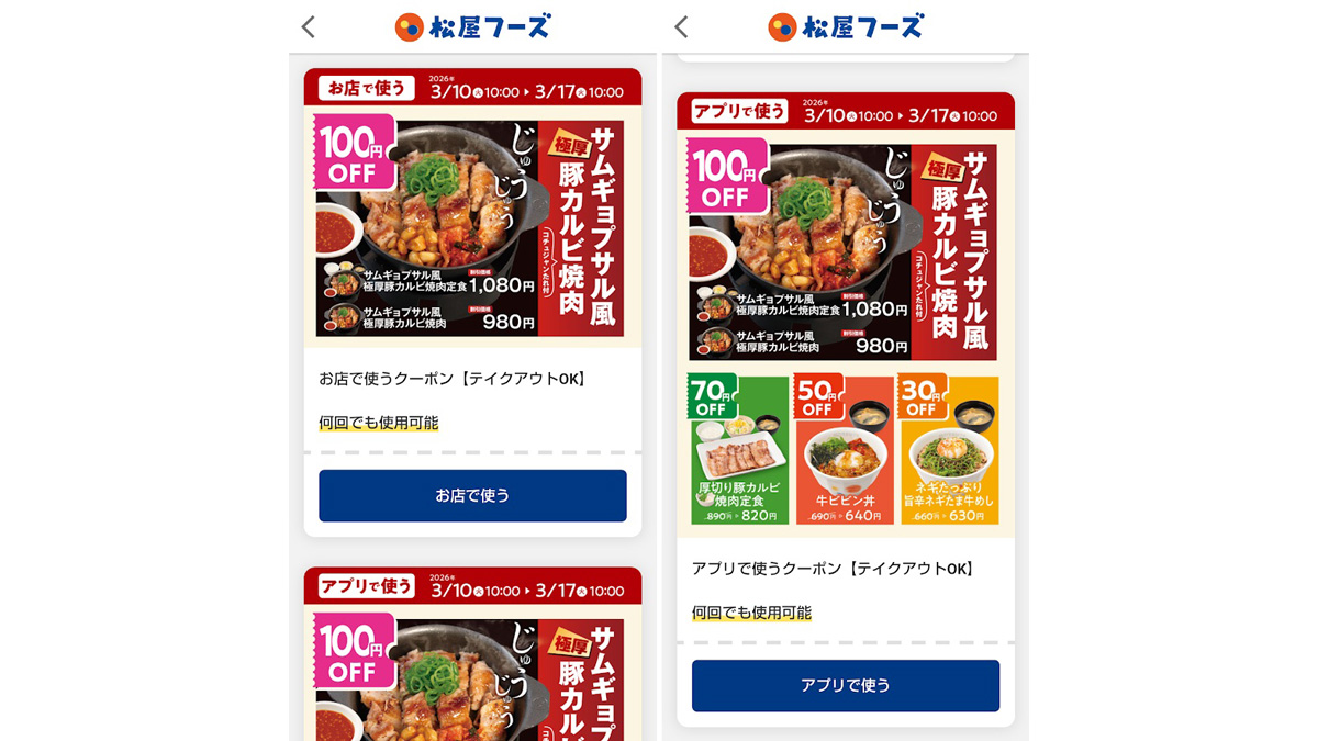 松屋公式アプリでは、お店で利用できる100円割引クーポン、アプリで使える30円~100円割引クーポンがある。もし、食べたいものがあれば利用してお得に食べよう。このほか、「松弁ネット」を半年以上利用していない人向けに、12メニュー最大70円引きになるクーポンを配信している。