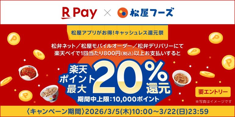 ただし、もっとお得かもしれないのが、「松弁ネット」や「松屋モバイルオーダー」、「松弁デリバリー」から税込800円以上注文して、楽天ペイで支払うと楽天ポイントが最大20%還元になるキャンペーンだ。これは期間中上限1万ポイントなので、5万円利用して1万ポイント還元の計算。「Visa割」のように、6,667円の支払い額やキャッシュバック上限1,000円分を気にして利用しなくてもよい。