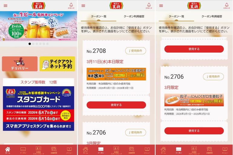 餃子の王将アプリには、定期的にお得なクーポンが配信されている。