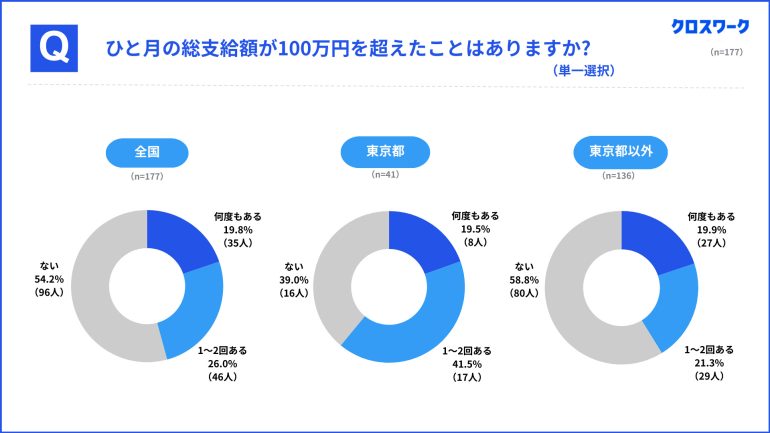 特に東京都のタクシー運転手は月収100万円到達経験者が多く、61%に達している。東京都以外では41.2%で、東京と地方の差が顕著となった。