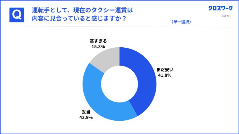 現状の運賃が仕事内容に見合っているかを聞いたところ、「妥当」(76名、42.9%)、「まだ安い(もっと高くてもよい)」(74名、41.8%)と回答した。