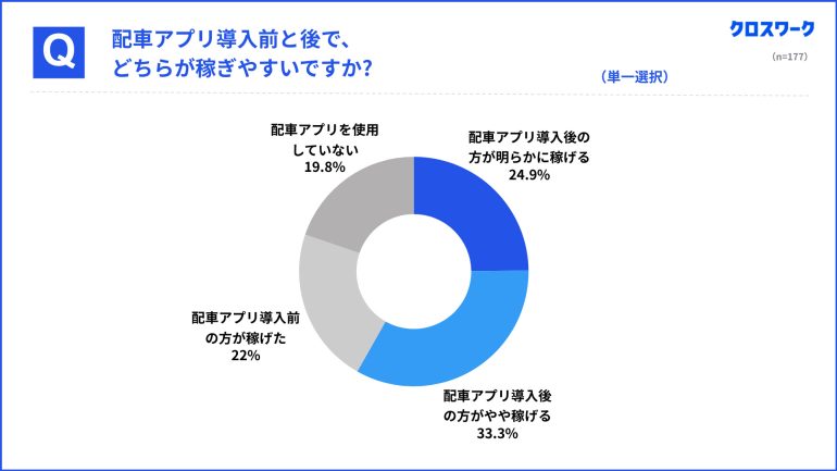 収入環境の変化について尋ねたところ、配車アプリ導入後に「明らかに稼げるようになった」(44名、24.9%)、「やや稼げるようになった」(59名、33.3%)と回答し、合わせて約58%が収益面での変化を実感していることがわかった。