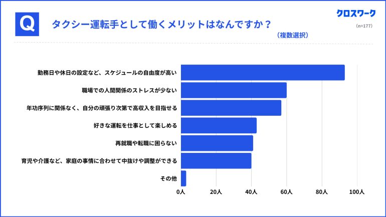 タクシー運転手として働くメリットを聞いたところ、最多は「スケジュールの自由度が高い」(93名、52.5%)となった。人間関係のストレスの少なさ(60名、33.9%)や、成果次第で収入を伸ばせる点(57名、32.2%)も上位に挙がっており、裁量の大きさが魅力として認識されている様子がうかがえる。