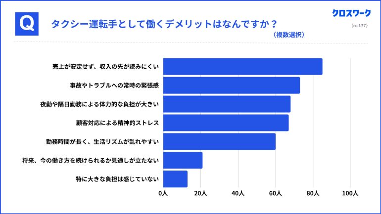 一方で、デメリットについては「売上が安定せず、収入の先が読みにくい」(85名、48.0%)が最多となった。次いで、「事故やトラブルへの常時の緊張感」(73名、41.2%)、「夜勤や隔日勤務による体力的な負担」(68名、38.4%)、「顧客対応による精神的ストレス」(67名、37.9%)、「勤務時間が長く、生活リズムが乱れやすい」(60名、33.9%)が挙がっている。収入面の不安定さや心身への負担が、課題として認識されていることがわかる。