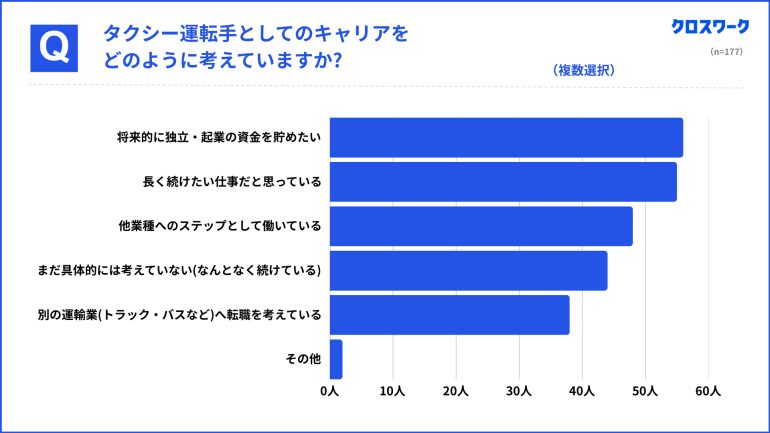 一方で、「独立・起業の資金を貯めたい」(56名、31.6%)、「他業界へのステップにしたい」(48名、27.1%)、「別の運輸業(トラック・バス)への転職を検討」(38名)といった回答も見られた。44名(24.9%)は「まだ具体的に考えていない」としている。