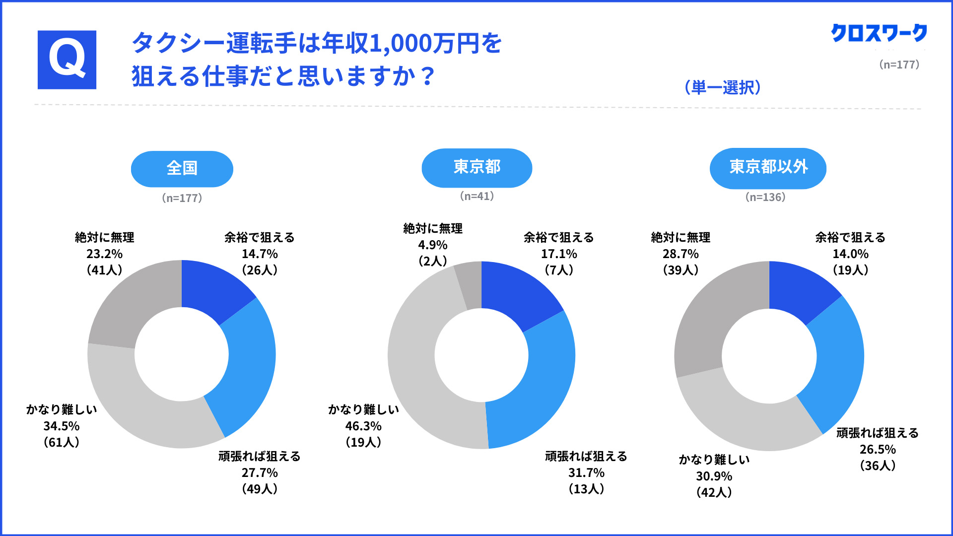 一方で東京都以外では、余裕で狙えるが19名(約14%)頑張れば狙えるが36名(26.5%)に対し、それを上回る39名(28.7%)が絶対に無理と回答している。