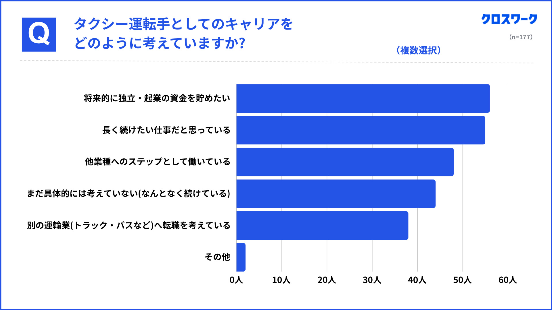 一方で、「独立・起業の資金を貯めたい」(56名、31.6%)、「他業界へのステップにしたい」(48名、27.1%)、「別の運輸業(トラック・バス)への転職を検討」(38名)といった回答も見られた。44名(24.9%)は「まだ具体的に考えていない」としている。
