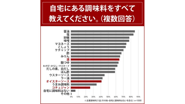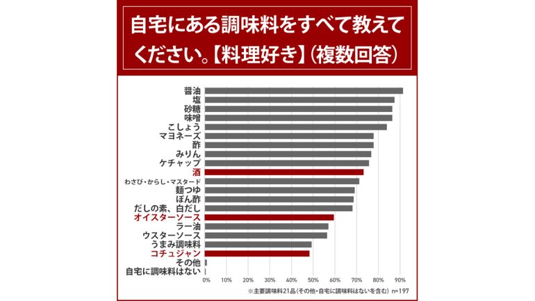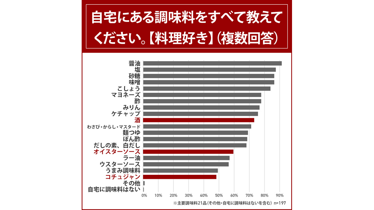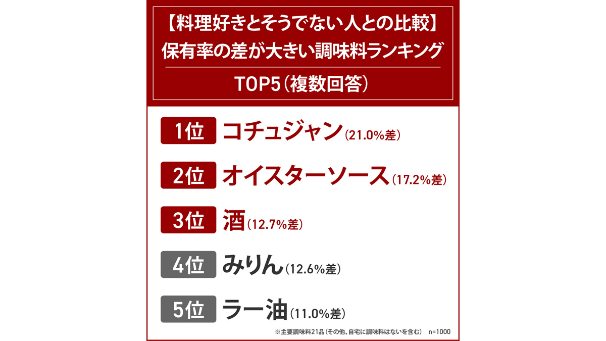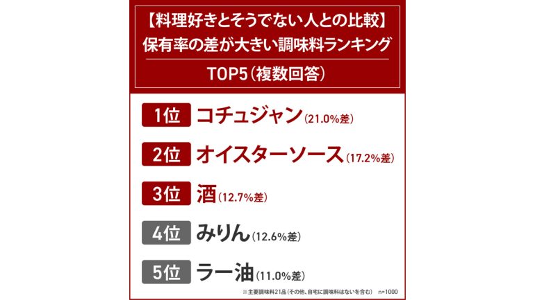 さらに、自身で料理することが「好き」「どちらかというと好き」と回答した人と、そうではない「嫌い(19.0%)」「どちらかというと嫌い(28.4%)」と回答した人で自宅にある調味料を比較。結果は、1位「コチュジャン(21.0%差)」、2位「オイスターソース(17.2%差)」、3位「酒(12.7%差)」となった。上位には味のバリエーションや深みを出す調味料が並び、料理へのこだわりが保有率の差に直結していることがわかる。