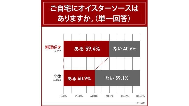 「オイスターソース(40.9%)」は全体の約4割だった一方で、「料理好き」の約6割(59.4%)は自宅にオイスターソースがあった。自宅にある調味料を全体と「料理好き」で比較したところ、全ての項目において料理好きの保有率が全体を上回る結果となった。