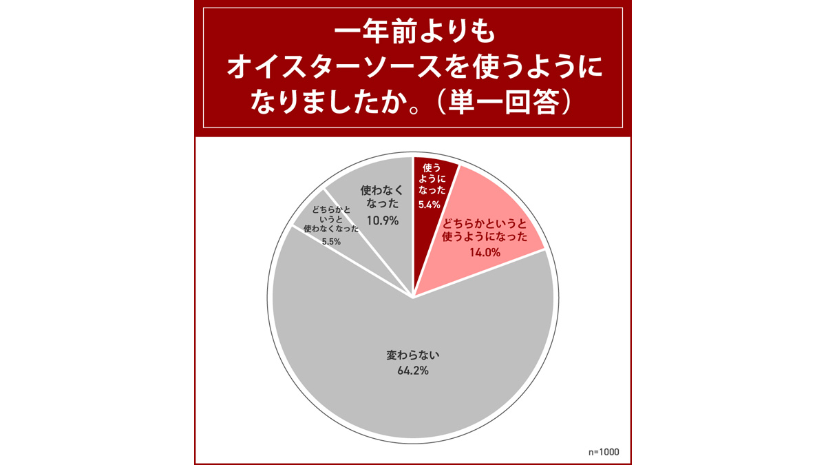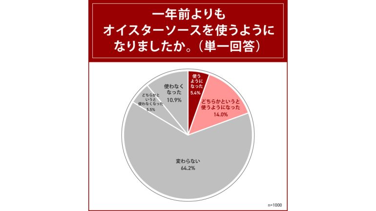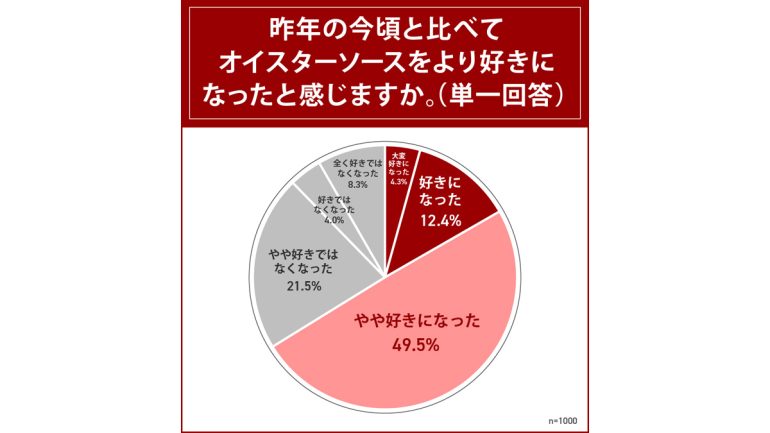 さらに、オイスターソースだけにフォーカスして、約一年前と比べて、変わったことがあったのか調査した。好きになったかという質問では、「大変好きになった(4.3%)」「好きになった(12.4%)」「やや好きになった(49.5%)」と回答した人を合わせると全体の66.2%で、多くの人がオイスターソースに対して好意的になったことが明らかになった。