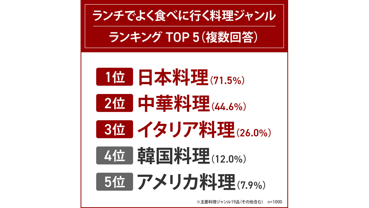 ランチでよく食べに行く料理ジャンルに関する質問で、最も多かったのは7割以上が回答した「日本料理(71.5%)」。定食やうどん、そばといった、日常的に飽きのこない安定した選択肢がある日本料理が支持を集めた。一方で2位の「中華料理」も票を集め、ランチタイムに手早く、かつ満足感のあるスタミナ料理として、人気であることが明らかに。続いてパスタやピザなどランチの定番と言えるイタリアンも3位に入った。