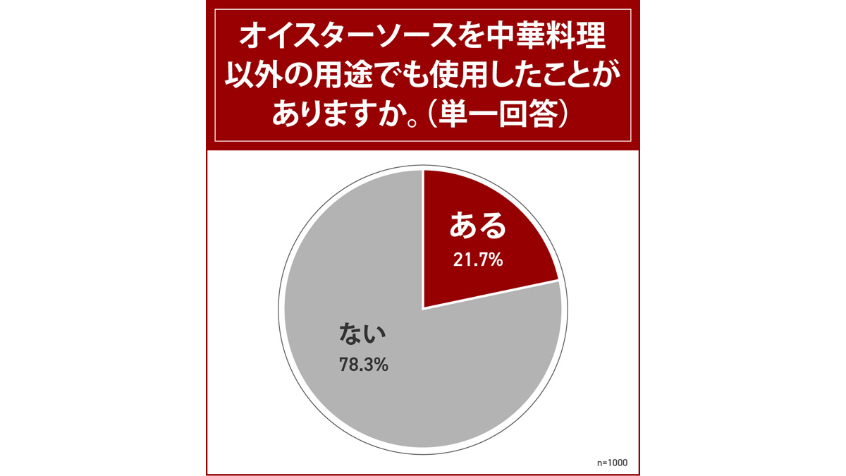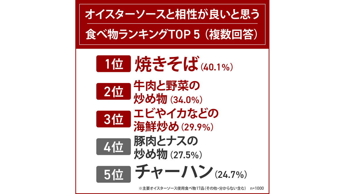 「エビやイカなどの海鮮炒め(29.9%)」と「豚肉とナスの炒め物(27.5%)」についても3割近くが回答したほか、ご飯ものである「チャーハン(24.7%)」にも回答が集まった。お肉や野菜、海鮮、ご飯など、幅広いメニューと合うオイスターソース。特定のメニューに限定されず、冷蔵庫にある食材を美味しく引き立てる調味料として認識されていることがうかがえる。