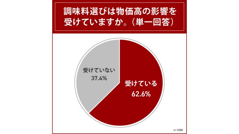 昨今の物価高騰を受け、家庭での調味料選びにどのような変化があったのか調査を行った。その結果、全体の6割以上となる62.6%の人が何かしらの影響を受けている実態が浮き彫りになった。