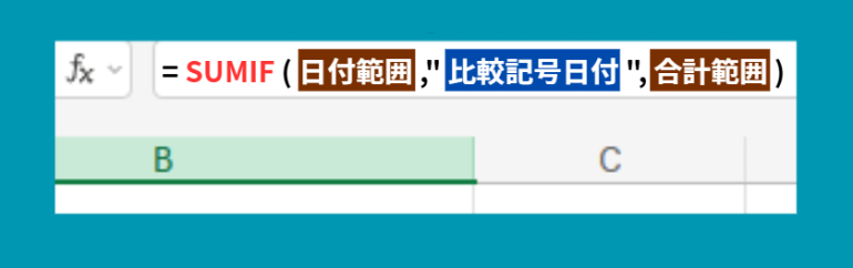 条件となる日付を任意のセルに入力して合計することもできます。基本構文は以下の通りです。