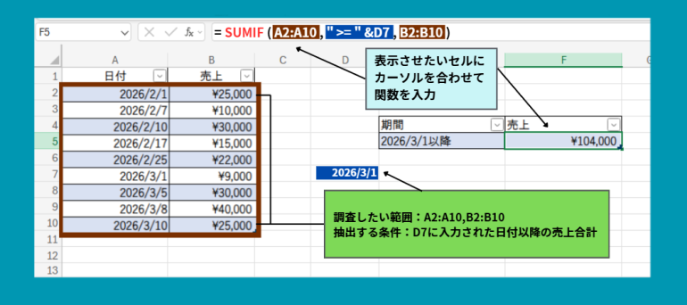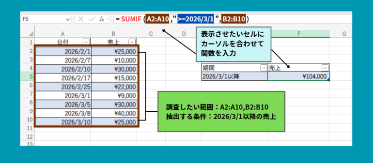 この式では、A列の日付が『2026/3/1』以降のデータだけを対象に、B列の売上を合計します。