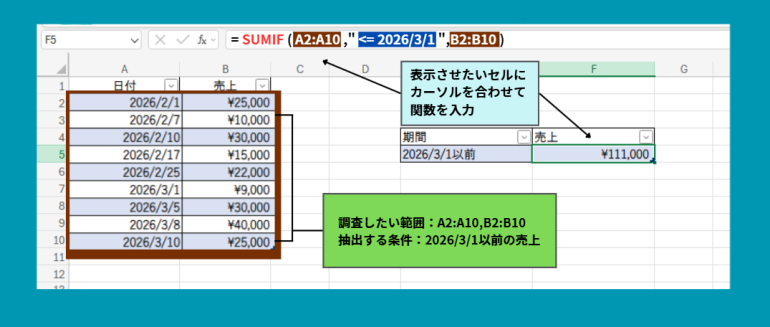逆に、2026年3月1日以前の売上を合計したいときは、比較記号を”<=”に変更し、以下の数式を記入します。