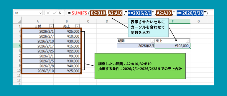 例えば、2026年2月の売上を合計する数式は次のようになります。