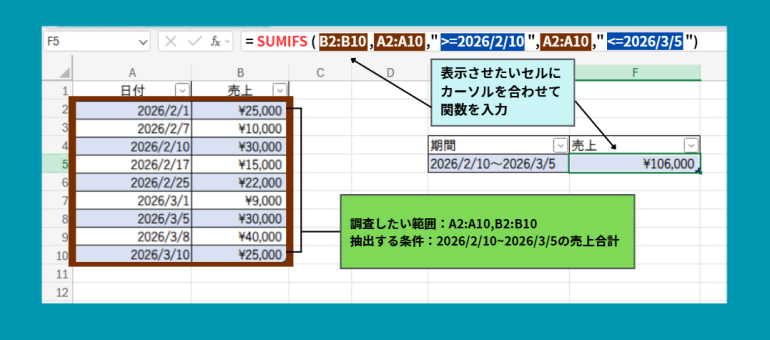 例えば、2026年2月10日〜2026年3月5日のデータを合計する場合は以下の数式になります。