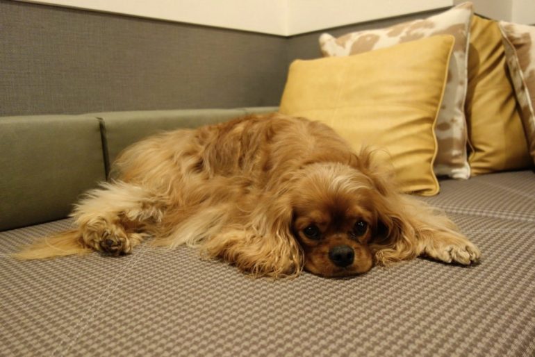 夜はバスタブに、アメニティーバーにあるバスソルトを入れてバスタイム。ゆったりサイズで硬めのマットレスのベッド(ソファ、ベッドとともに愛犬が上がってもOK)で心地よい眠りについたのでした。アーモンドはL字の大型ソファが寝床としてお気に入りのようでした・・・。