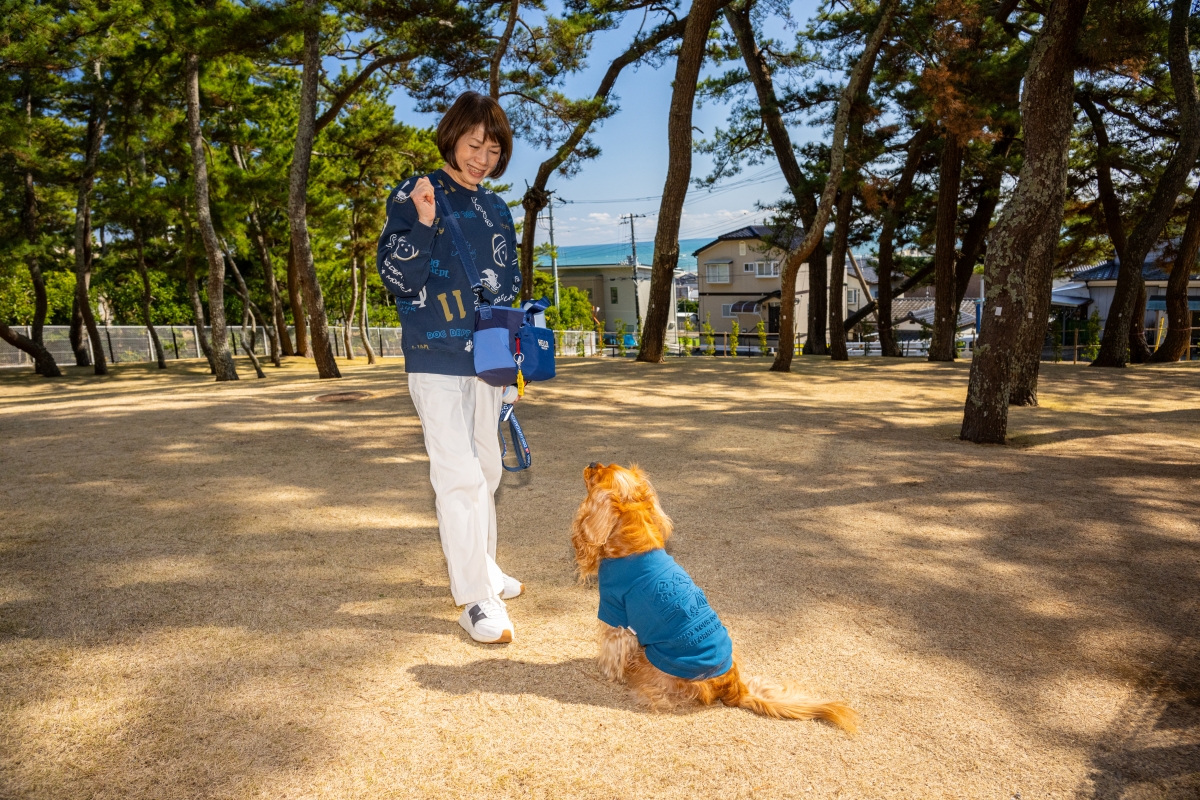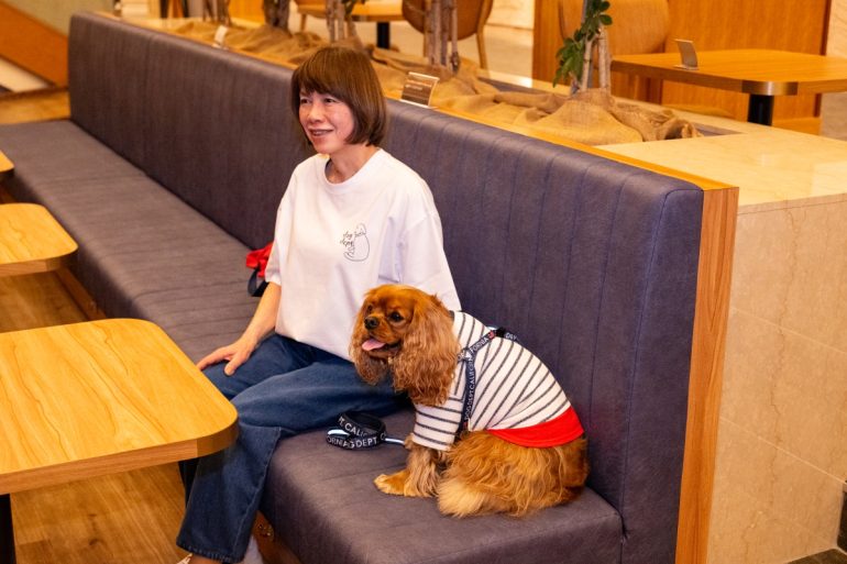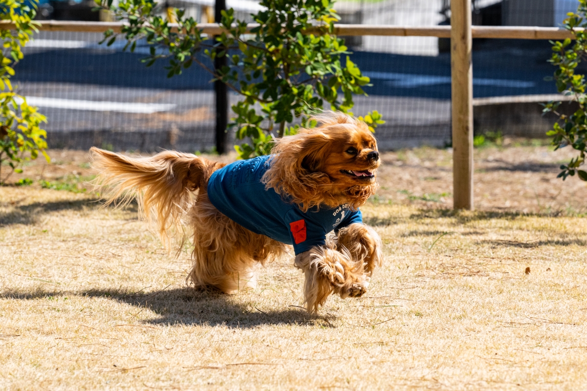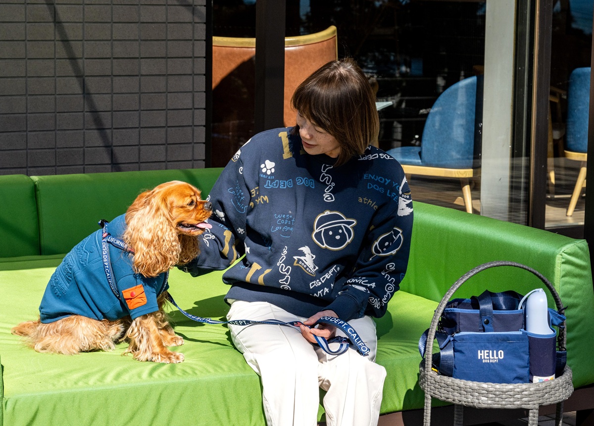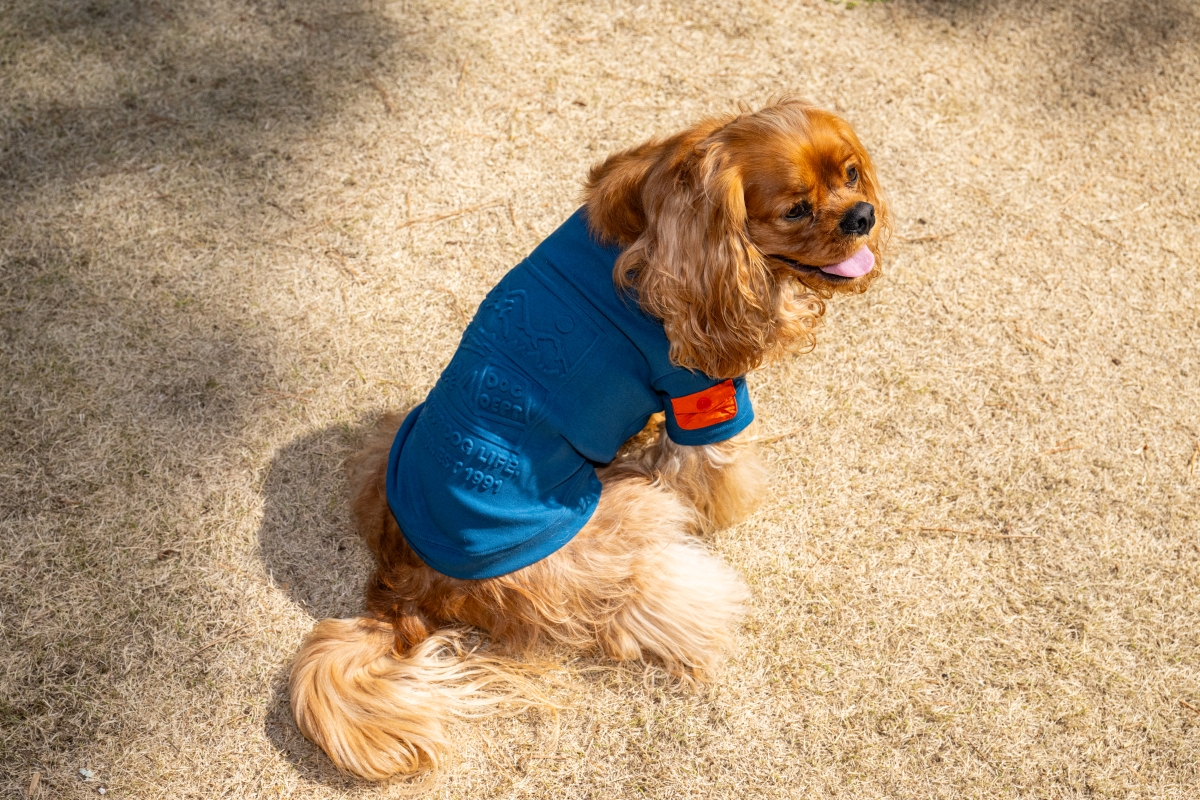 そのインナーに着用しているのがドッグモチーフの復刻Tシャツ「ドッグイラストT」。接触冷感、抗菌、UVカットなどの嬉しい機能性ウェアとなる着心地抜群の1枚です。こちらもドッグウエアとのペアルックが可能。そしてディナータイムからキャバリアのアーモンドが着ているのが、フレンチディナーに合わせたフランス国旗のトリコロールを意識したドッグウエア「差し編みパイルレイヤーT」。柔らかなパイル地で快適な着心地が心地よく、袖のパームツリーと裾のカラーがアクセントになっていて、「愛犬と過ごす海辺の休日」をテーマにした「ドギーズコースト大洗」にぴったりではないでしょうか。カラーはアーモンドが着ているオフホワイトとサックスの2色で、サイズはXSから4L、DS、DM、BLの11サイズが揃っています。