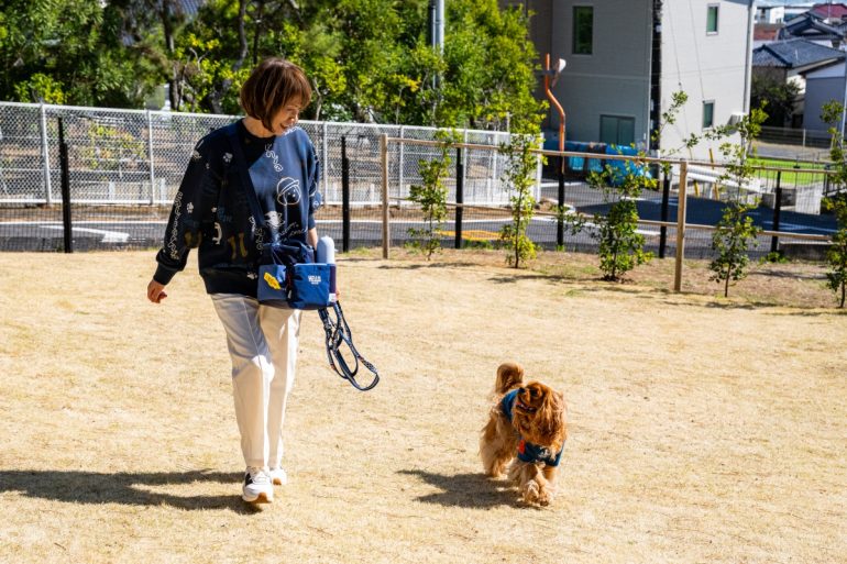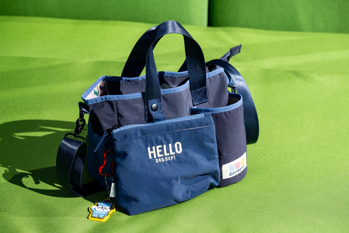 持っている新作のお散歩バッグは「マルチカラーマナーポーチ付きお散歩バッグ」。取り外し可能なマナーポーチには消臭加工生地が使用され、本体はポケット多数のため、使いやすさ抜群。カラーは写真のネイビー、マルチカラー、カーキの3色。サイズは写真のMのほか、ゆったりサイズのLもあります。