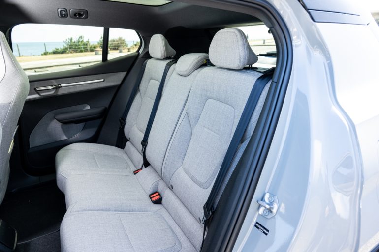 ボルボ最小サイズと聞くと、室内の広さが心配になるかも知れないが、身長172cmの筆者のドライビングポジション基準で前席頭上に230mm(ガラスルーフ)、後席頭上に150mm、後席膝回りに120mmのスペースがある。例えばレクサス最小のSUVであるLBXが、同195mm、110mm、120mmだから、頭上方向ではEX30が圧倒し、後席膝回りは同等ということになる。いずれにしても、ボルボのラインナップの中では前席優先パッケージの1台ということになるものの、大人でも後席に無理なく乗車できることは確かである。