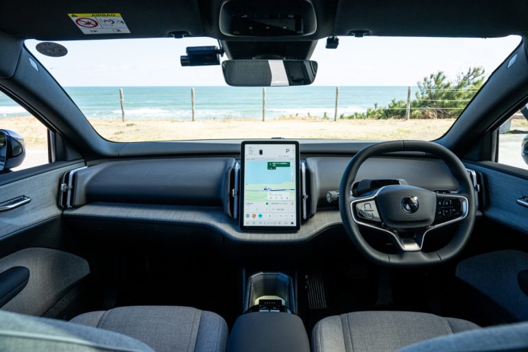 インテリアのモダンですっきりとした印象は、メーター&インフォテイメント&各種操作機能をインパネ中央の12.3インチタブレット型センターディスプレーに集約しているからで、スピードメーター、ナビ機能、時計、外気温時計、エアコンやオーディオ操作、ドアミラー調整、2026年モデルでオフ/低/高の3モードが選べるようになった完全停止まで行えるワンペダルモードなどの各種機能、操作がそこに配置されている。