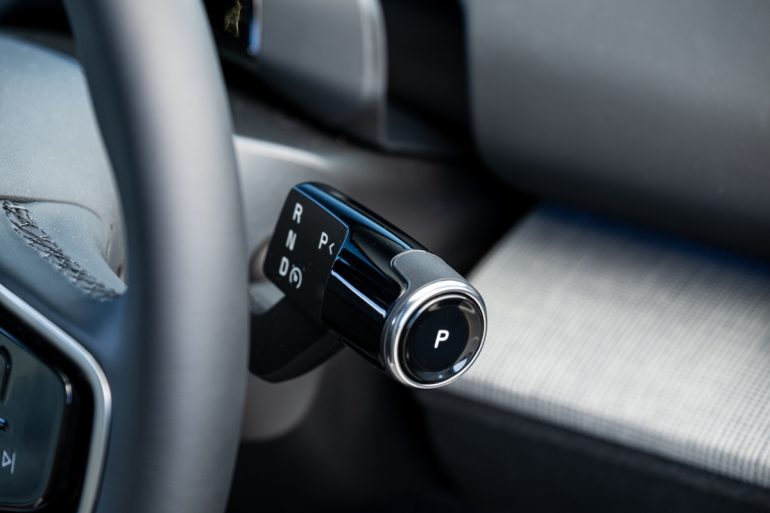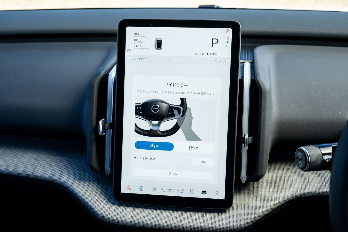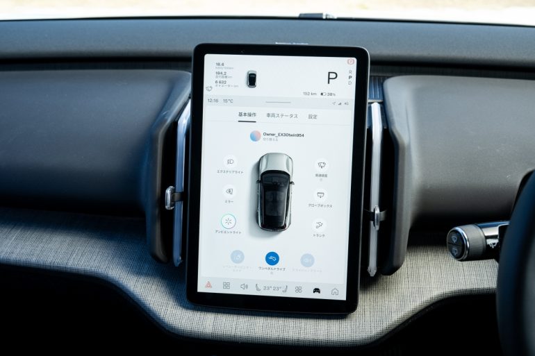さて、デジタルキーを携帯していれば、クルマに近づくだけでドアがアンロックされ(クルマから離れると自動でロックされる)、運転席に乗り込み、パワースイッチを押すことなく”電源ON”となって走り出せるのは、EX30全車の共通点。日本車ならウインカーレバーに相当するレバーがシフターとなり、Dレンジに入れればOKだ。