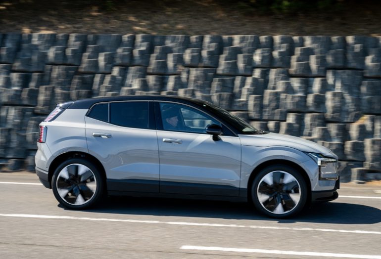 驚きを隠せないのは合流、追い越しシーンで見せた0-100km/h3.6秒を誇る強烈すぎる加速性能だ。ドライブモードの「ノーマル」でもとんでもなく速いのがEX30だが、「パフォーマンス」にセットすればアクセルレスポンスが俄然、高まるとともに、パワーユニットからのノイズほぼ皆無のまま、まるでワープするような、血の気が引くような圧巻の加速力をそうしたシーンで発揮。まさに羊の皮をかぶった狼・・・そのものだ。
