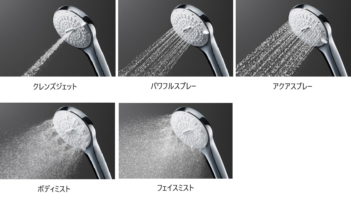 「SPA U」では、シャワーの水圧や、ミストの細かさなどの浴び心地は家族それぞれで異なるものと考え、5つの吐水モードを搭載。刺激を感じながら髪の根元まで洗える強力な水流の「クレンズジェット」、勢いのある水流ですっきりと洗い上げる「パワフルスプレー」、空気をたっぷりと含んだ大粒の水滴で洗い上げる「アクアスプレー」、水の粒が大きく温かいミストで全身を洗える「ボディミスト」、微細なミストでやさしく汚れを洗浄する洗顔におすすめの「フェイスミスト」から、気分やシーンにあわせて使うことができる。