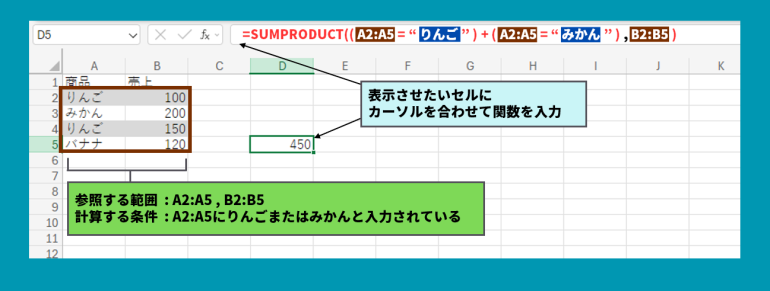 =SUMPRODUCT((A2:A5="りんご")+(A2:A5="みかん"),B2:B5)
