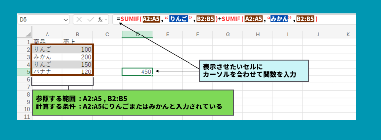 次に、A2:A5に入力されているみかんの数値が計算され、両方の数値が足されることで、「りんごまたはみかんの合計」が集計できるのです。