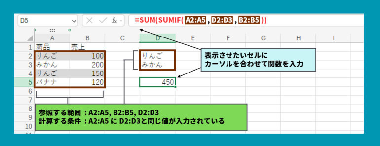 この数式では、まずA2からA5まで(A2:A5)に入力されているりんごの合計数値を計算しています。