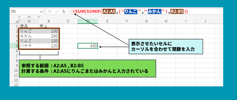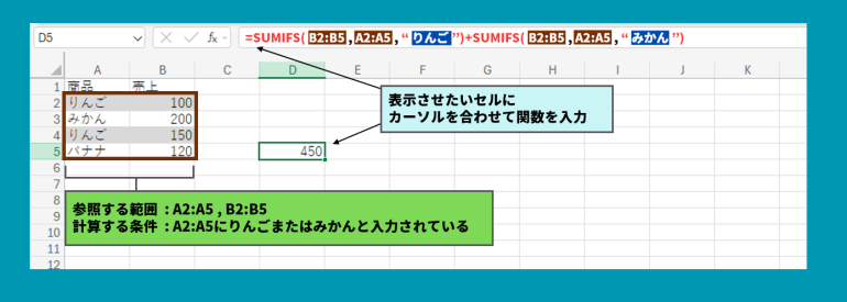 =SUMIFS(B2:B5,A2:A5,"りんご")+SUMIFS(B2:B5,A2:A5,"みかん")