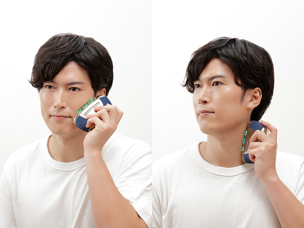 これらは肌の外側からは距離があり、通常の美顔器では効率よく刺激しづらい部位。そこで、電気抵抗が少なく水分を多く含む口腔内からアプローチするという発想が生まれた。