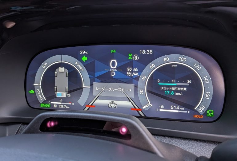 もちろん、エコを意識した運転も不可欠。不要なアイドリングをせず、急加速を避け、スムーズなアクセルコントロールを心掛けたい。そこで威力を発揮してくれると思っているのが、メーターに表示可能な平均燃費計だ。これを常に表示しつつ意識して走ると、筆者がそうしているように、燃費のいい走りが可能になる。例えば、平均燃費計が16.9km/Lを示していたとすれば、運転、アクセルコントロールの仕方でなんとか17km/L台に乗せたい・・・という燃費向上欲!?がわき、エコな運転、走り方、アクセル操作を自然に行えるようになるというわけだ。