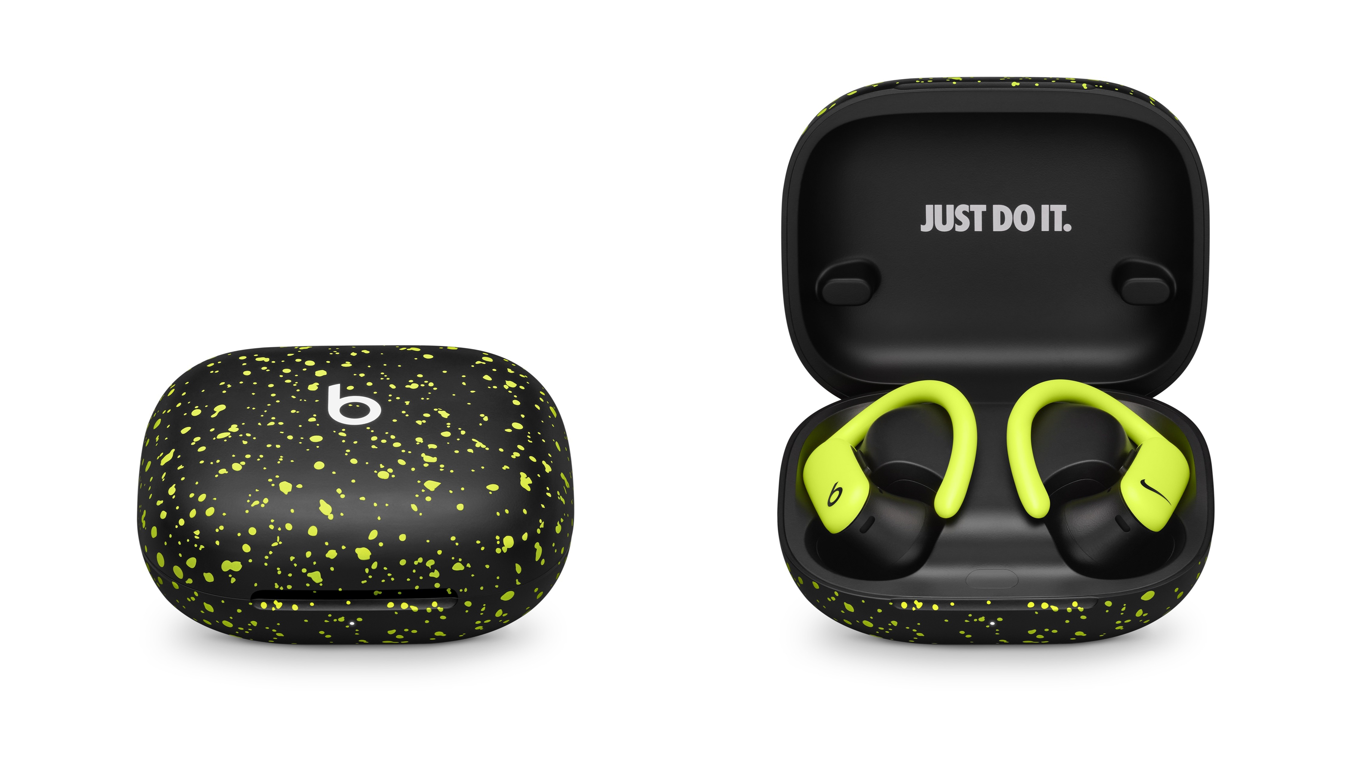 また、イヤフォン本体には、大胆なカラー「ブラック&ボルト」を採用。さらに、Qi充電に対応したケースには、鮮やかなボルトカラーのスプラッターパターンが施され、蓋の内側には「JUST DO IT」の文字も刻まれている。