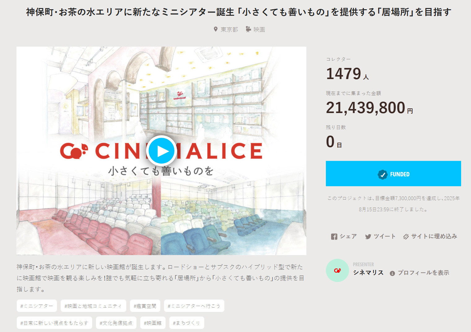 2025年12月、東京・神保町、お茶の水エリアにミニシアター「CineMalice(シネマリス)」がオープンした。設立に向けて実施されたクラウドファンディングでは総額2143万9800円、なんと目標額の293%もの資金を集め、映画ファンの熱烈な期待を背負っての船出となった。