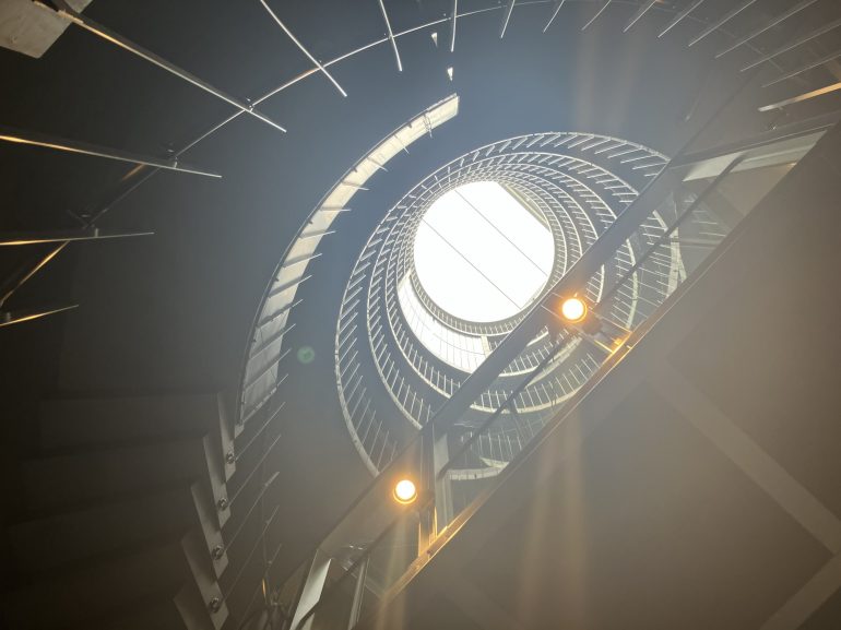 小さな看板を頼りに中へ入ると、大きならせん階段が見えた。「本当にここで合っているのか?」と少しドキドキしながら地下へと下っていく。階段を下りて上方を見ると大きな吹き抜けになっていて、とても解放感がある。